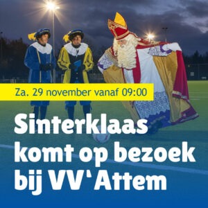 Zaterdag 29 november wordt extra gezellig bij VV Hattem! Voor alle kinderen van 3 tot en met 6 jaar organiseren we een feestelijke voetbaltraining samen met Sinterklaas en zijn Pieten.