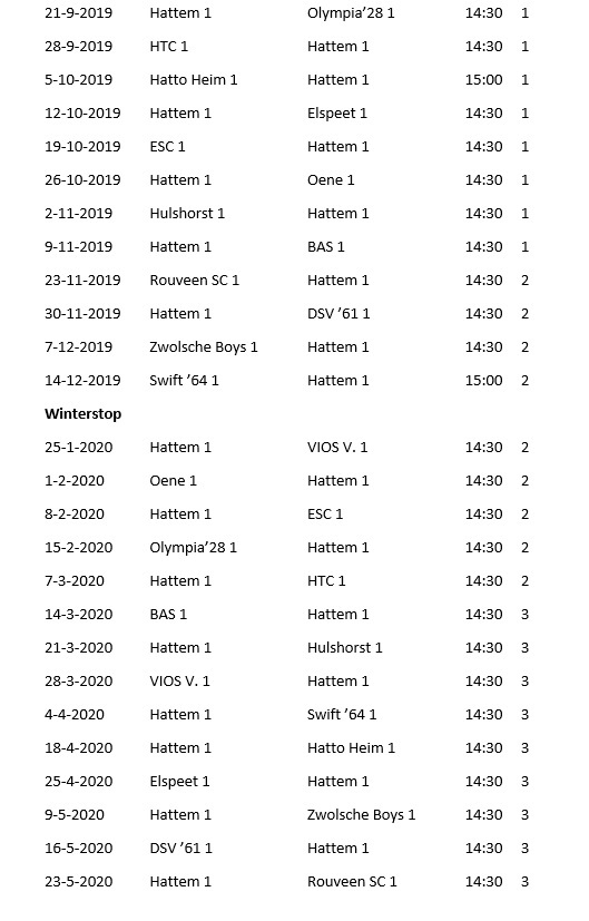 De KNVB heeft het de competitieprogramma’s bekend gemaakt via Voetbal.nl. Voor Hattem 1 is het programma als volgt.